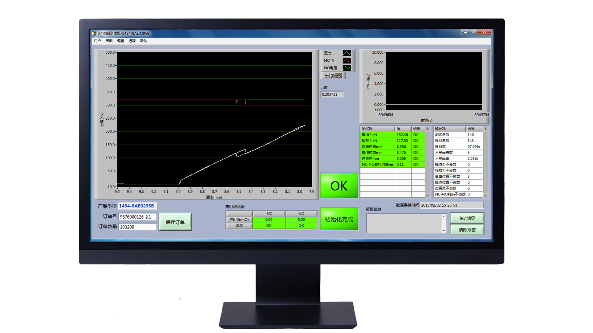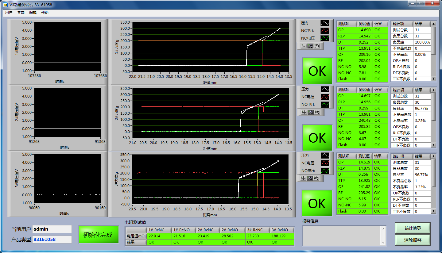 微动开关功能测试软件是专门针对微动开关自动组装生产线上成品电性能测试开发的。由工控机,运动控制卡、压力传感器、NI模拟采集卡和专门的性能测试软件组成。主要测试微动开关的触发点位置(OP),释放点位置(RLP),差值(DT),操作力(OF),释放力(RF),NC-NO转换时间等性能参数,保证产品的质量,避免不良品流到客户手中。